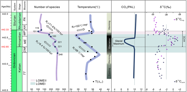 基于上述精确的年代学框架,研究团队进一步确定了晚奥陶世生物大灭绝事件起始于442.76 +0.35/-0.22 Ma(约4.428亿年前),持续了约40万年,并呈现出明显的两阶段模式。第一阶段持续约34万年,期间全球气候从温室状态过渡至赫南特冰期,降温幅度达到9°C,平均降温速率为2.6°C/十万年,平均物种相对灭绝速率为8.4%/十万年;第二阶段持续约6万年,全球气候迅速由冰室状态转变为温室状态,平均升温速率高达12.2°C/十万年,物种相对灭绝的平均速率急剧上升至71.6%/十万年。