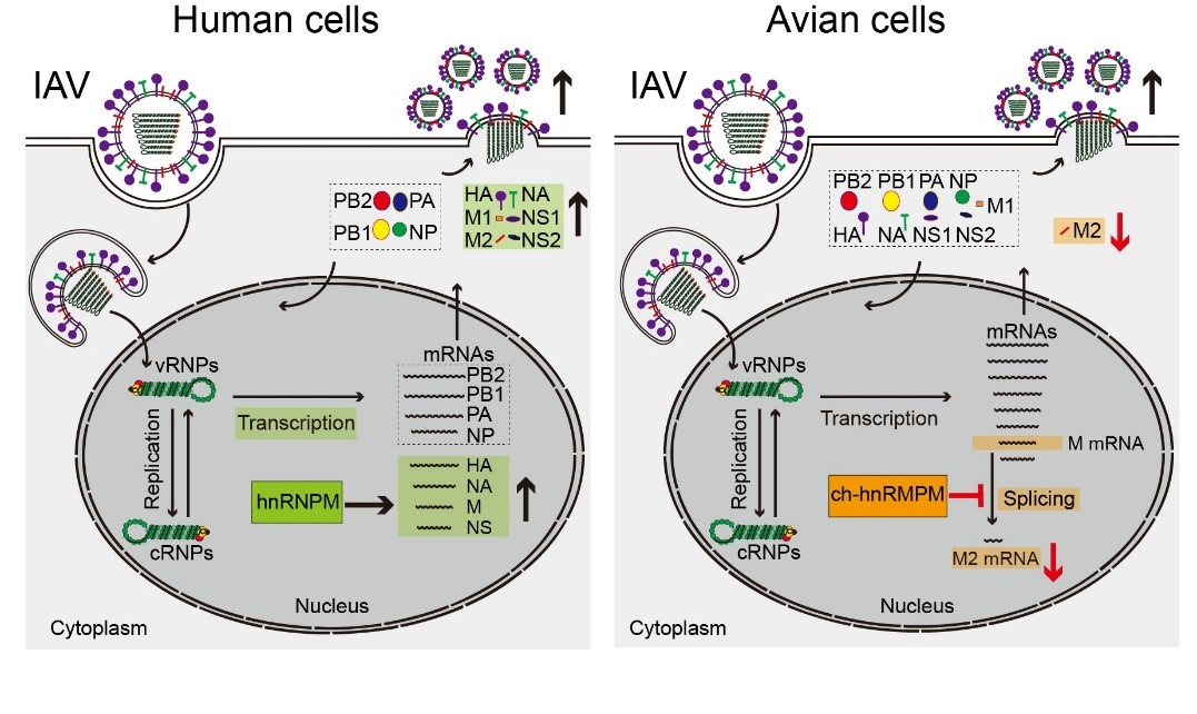 hnRNPM物种特异性调节甲型流感病毒在人源与禽源细胞中复制的模型