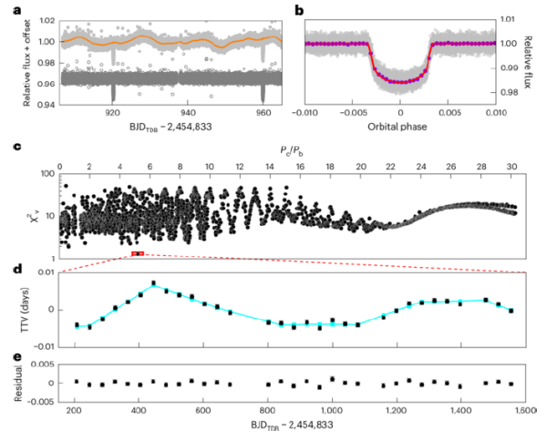 凌星行星Kepler-725b的光变曲线和TTV图样。TTV反演结果表明,系统中还存在一颗“超级地球”Kepler-725c。