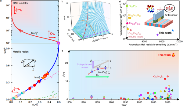 ( a、b)反常霍尔角的双变量函数关系,(c)巨反常霍尔角,(d)磁性外尔半金属反常霍尔传感