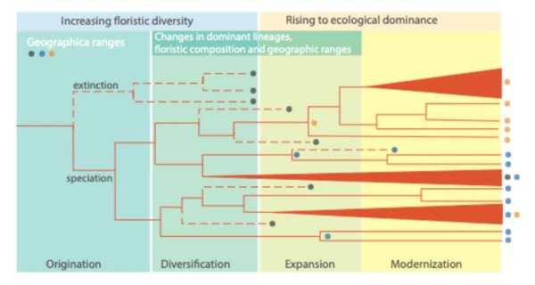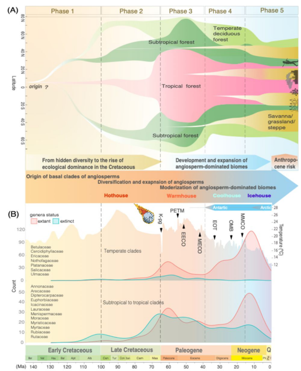 研究提出被子植物演化的五个关键阶段:(1)在早白垩世至中白垩世期间,被子植物经历了快速分化和分布范围的扩张;(2)被子植物生态优势的不断增强所带来的生态系统转型直到晚白垩世才逐步确立;(3)白垩纪–古近纪(KPg)之后,被子植物进一步重塑了陆地生态系统,类似于现代热带森林的组成与结构已经形成;(4)自中始新世气候适宜期之后,全球气温逐渐下降,大陆温度季节性差异增强,中高纬度的植被现代化转型开始;(5)新近纪以来,构成现代陆地生物多样性的冠群迅速辐射,并且随着纬度和垂直方向温度梯度的进一步加剧,各区域植物区系差异与组成至晚中新世基本确立。