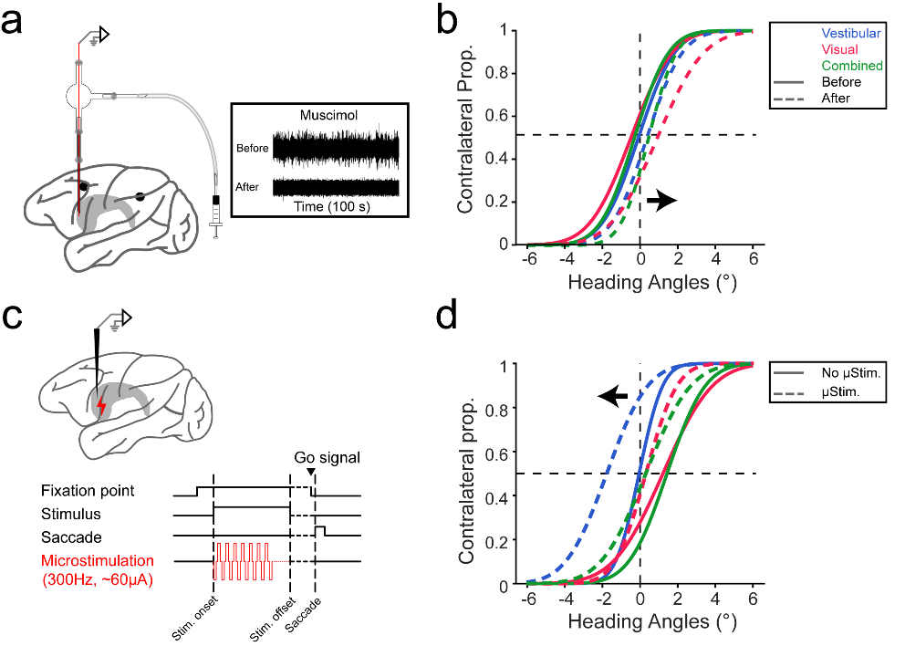(a)向目标脑区注射可逆性失活药物的示意图;(b)注射药物到CN中后引起了猕猴心里物理曲线的偏移;(c)向目标脑区注射微弱电流的示意图;(d)微电流干扰CN引起了猕猴心里物理曲线的偏移。