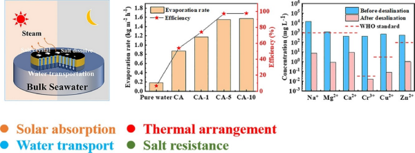 研究人员通过简单的沉积法制备了壳聚糖气凝胶-碳纳米管(CA-CNT) 双层结构的太阳能界面蒸发器。亲水性CA基材具有低导热性和垂直排列的孔道结构,有利于提升蒸发器的蒸发效率、水传输能力和耐盐性。上层CNT显示出95.04%的出色太阳光吸收率。在一个太阳能强度下(1 kw·m-2),蒸发器的蒸发速率为1.55 kg·m-2 ·h-1。在室外自然光条件下测试其实际适用性,淡水产量为7.15 kg·m-2·d-1,可以满足三个成年人一天的需水量。此外,该蒸发器还表现出良好的重金属和染料污水净化能力。这项工作为从海水和污水中获取淡水提供了一种简单的策略。