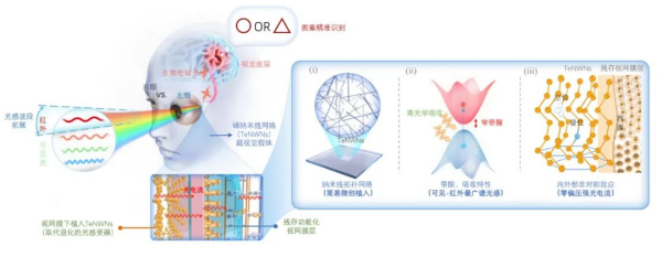 当前,全球有超过2亿的视网膜变性患者,无法看到多彩的世界。近年来,学术界一直在探索通过人工方法进行视觉修复,如利用光电二极管技术路线制备可植入的视网膜假体。但是,该方法制备工艺复杂,且感知的光谱波段范围有限。而引入红外视觉能够使得人类拥有感知弱光信号的能力。