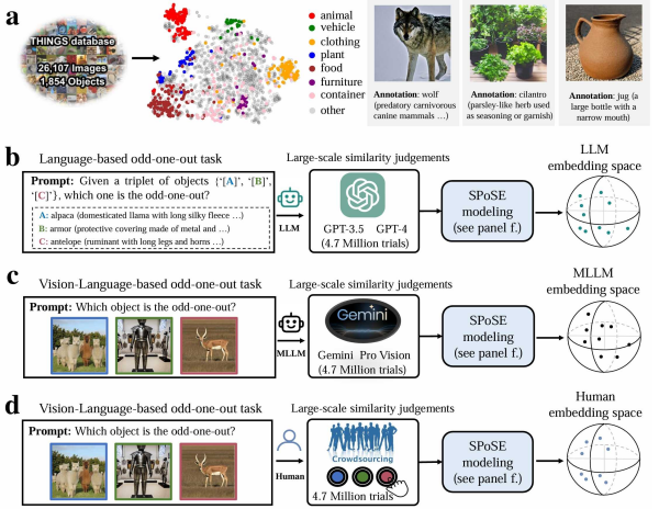 实验范式示意图。a、物体概念集及带有语言描述的图像示例;b-d、分别针对LLM、MLLM和人类的行为实验范式和概念嵌入空间。
