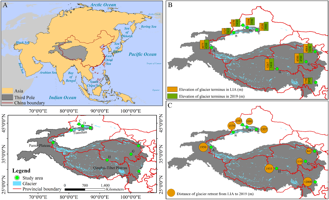 (A)研究区地理区位图;(B)被研究冰川在小冰期和2019年的冰川末端海拔;(C)被研究冰川在小冰期至2019年间的冰川退缩距离