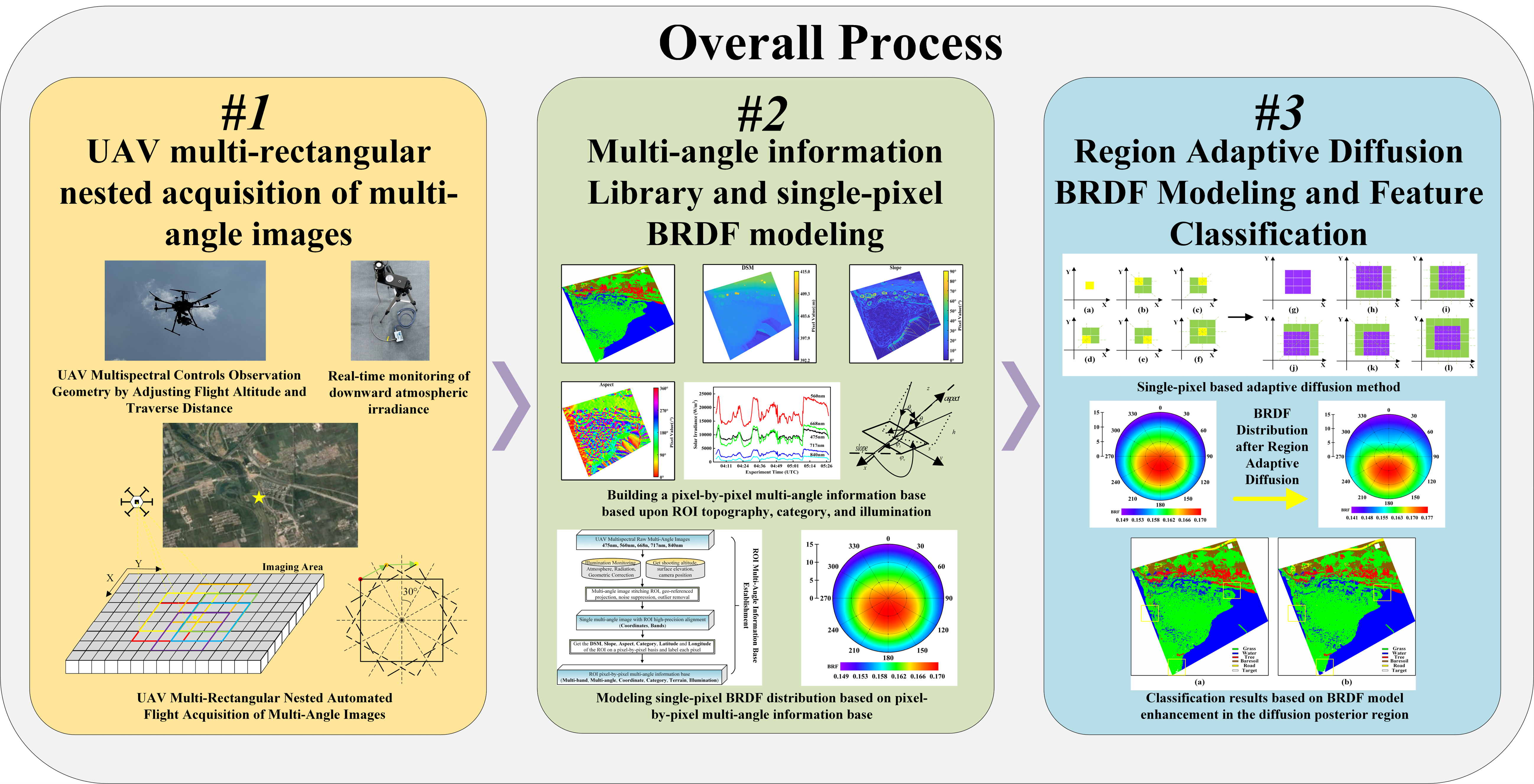 针对上述问题,无码影片 西安光学精密机械研究所副研究员李海巍团队联合研究员王爽,首创无人机多矩形嵌套飞行方案,并基于多角度影像计算了研究区域单像素类别、坡度、坡向等属性,构建了多角度信息库。研究人员利用该信息库,对Hapke、Kernel、RPV模型进行适应性改进,将建模尺度精确到单个厘米级像素。进一步,研究提出自适应扩散理论,并结合自适应感知扩散窗口,将单个像素建模结果扩散到最大最优观测区域,实现高精度建模。基于此,高精度模型的地物分类精度从91.65%提升至97.23%。
