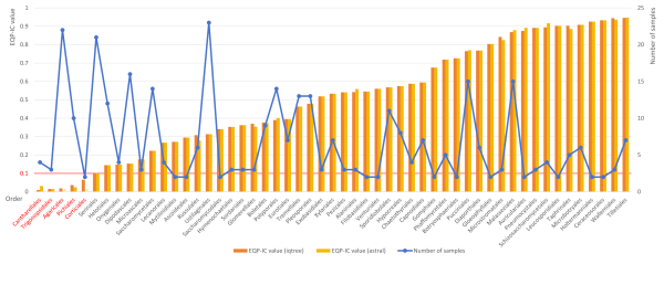 子囊菌门和担子菌门下各目的EQP-IC值统计图