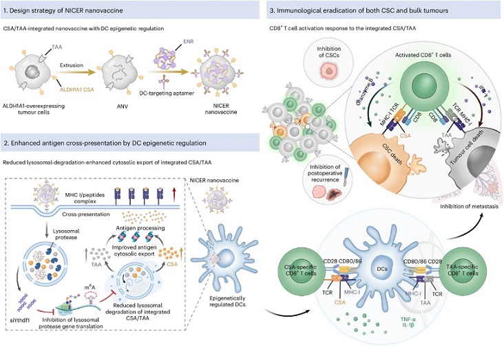研究人员基于肿瘤相关抗原和肿瘤干细胞特异性抗原集成化表达的肿瘤细胞纳米囊泡,开发了表观遗传调控的抗原集成化纳米疫苗(NICER),该疫苗可同时实现对肿瘤细胞与肿瘤干细胞免疫清除。研究显示,通过靶向树突状细胞的甲基化识别蛋白YTHDF1,该疫苗可有效降低树突状细胞的溶酶体蛋白酶表达,降低集成化抗原降解,提高抗原交叉提呈效率。与无疫苗治疗组相比,该疫苗抗原交叉提呈效率提高了1至2倍,增强了该疫苗免疫效力。同时,该疫苗可显著抑制肿瘤增殖及肿瘤干细胞介导的肿瘤复发与转移。与无疫苗治疗组相比,该疫苗肿瘤抑制率提高了约5至7倍。