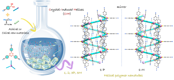 螺旋纳米管作为一类具有独特手性特性的纳米结构,在手性光学、对映选择性识别与分离等领域展现出广阔的应用前景。在高分子化学领域,研究人员通过手性或非手性单体的聚合反应制备出多种螺旋共价聚合物。然而,这些合成方法仍存在两个显著局限性:所得产物多为开放的螺旋链状结构,难以形成封闭的纳米管构型;共价键连接的螺旋聚合物往往以非晶态或无规聚集体形式存在,极大地阻碍了对聚合物结构的原子级精确表征。动态共价化学因其在构建结晶性一维聚合物链方面的独特优势而受到广泛关注,该策略通过可逆共价键的形成与断裂,能够实现聚合物结构的自校正和有序排列。然而,将这一方法拓展至螺旋纳米管的合成仍面临困难,特别是在实现结构精确控制和增强稳定性方面。因此,开发新型合成策略以构建具有原子级精确结构的螺旋聚合物纳米管,仍是当前合成化学领域的一项挑战。