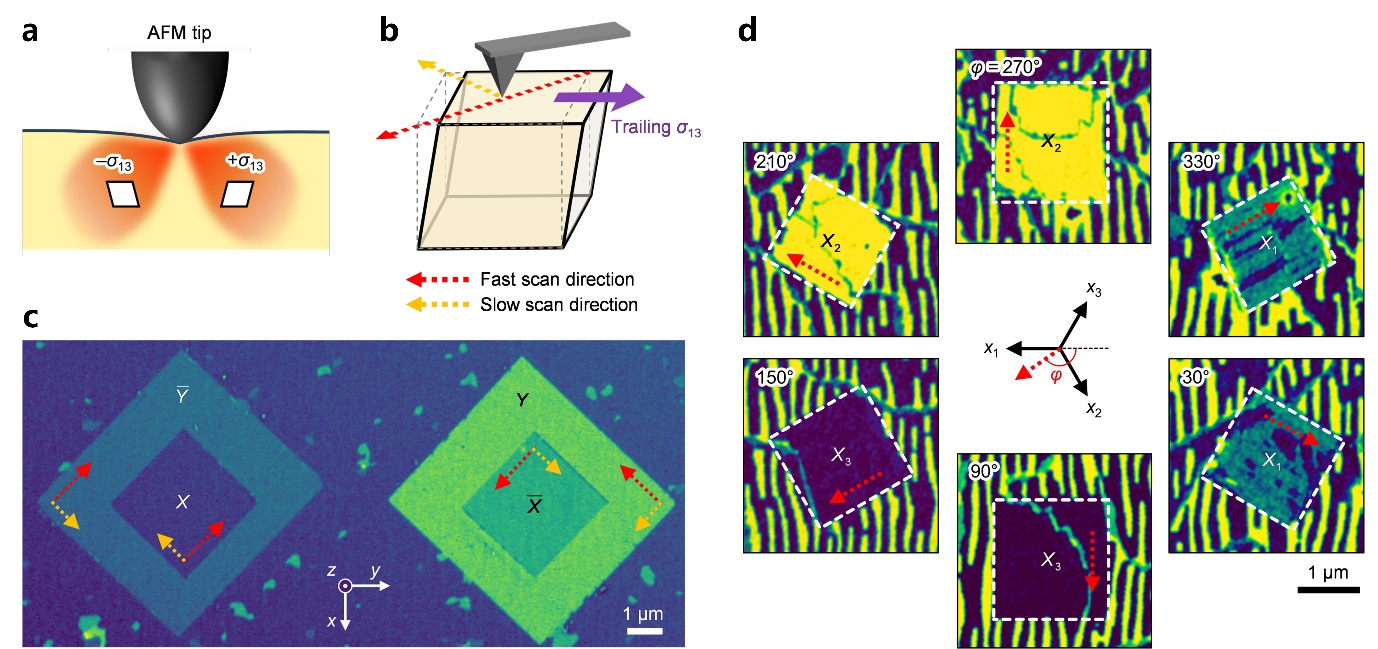 铁弹性“写入”与晶体方向选择。(a)原子力显微镜针尖加载下剪应力分布示意图,(b)根据快速与慢速扫描轴,由拖尾引起的晶体剪切示意图,(c、d)ECC图像展示了确定性的铁弹性“写入”。