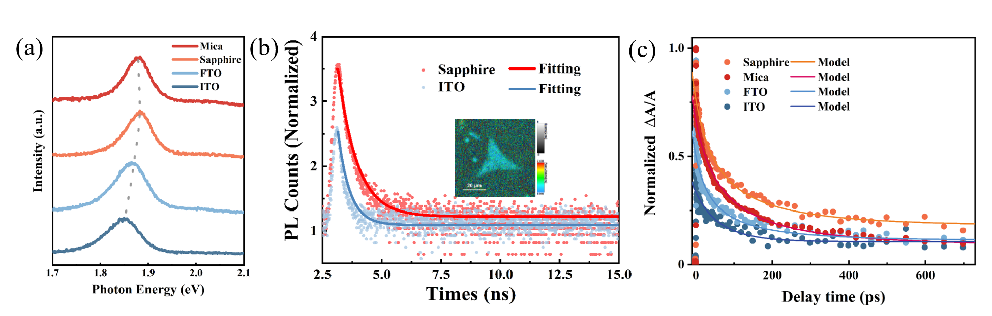 单层MoS2在不同衬底上的荧光特性、荧光寿命成像实验结果及瞬态吸收实验与模型结果