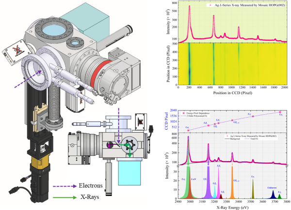 为进一步研究这类空心原子的产生与退激特性,科研人员自主研发了用于多空穴离子X射线精细结构测量的紧凑型宽带高分辨平面晶体谱仪。该谱仪采用针对多空穴离子X射线谱特点的独特几何构型,通过靶平动伴随晶体同步转动,大幅提升了谱仪调节精准度和便捷性。此外,该谱仪在紧凑的空间内实现了0.53-19.3 keV的动态范围及0.04-6.58 keV的单次曝光带宽,全动态范围内的能谱分辨力好于102,采用马赛克晶体时的探测效率较传统平面晶体谱仪提高了20倍以上。