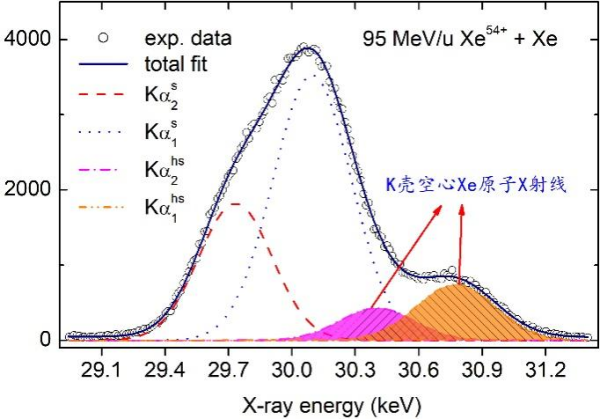 针对高效制备重空心原子并对其进行系统性研究的难题,科研团队在兰州重离子加速器冷却储存环及其气体内靶装置上开展了相关实验,利用能量95-197 MeV/u的全裸氙离子与氙靶碰撞,测量了反应后靶原子的X射线谱。研究发现,得益于全裸氙离子所携带的强库仑场及对称碰撞中内壳电子转移过程,相比K壳单空穴氙原子,空心氙原子的相对产额最高可达28.6%。该研究表明全裸重离子-原子碰撞是高产额制备重空心原子的有效途径。