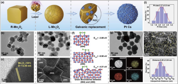 为增强Pt纳米颗粒的光收集能力,研究人员设计了Cs结构,利用金属颗粒间的光子散射效应,提高Pt纳米颗粒从可见光到近红外波段的光吸收效率。同时,将Pt纳米颗粒嵌入金属氧化物介电基质中,促进吸收介电表面散射的光子。研究发现,Pt离子与Mn3O4(四氧化三锰)表面发生电化学置换反应,可形成多孔的 Pt/Mn3O4纳米复合材料,其中Mn3O4作为牺牲剂,形成了负载超小Pt纳米颗粒的多孔骨架。