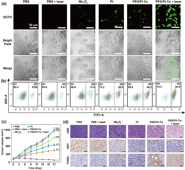 此外,研究人员进一步开展了小鼠体内肿瘤治疗实验,证实Pt纳米胶体球不仅发挥了显著的近红外光增强的级联催化治疗功能,成功抑制了肿瘤生长,还实现了磁共振成像监测肿瘤内部的代谢情况,充分体现了Pt Cs作为近红外增强型纳米酶用于光催化肿瘤治疗的潜力。该研究拓展了液相激光制备技术在构筑高性能纳米酶材料方面的应用。