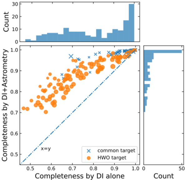近邻宜居系外行星的探测与表征是系外行星研究的前沿方向。 作为“探路者”,CHES将在科学发现上为下一代直接成像任务提供关键支持,特别是与配备高对比度星冕仪的HWO形成协同。HWO具备对近邻恒星系统中类地行星进行直接成像和光谱观测的能力,其观测目标与CHES高度重合。CHES提供的轨道先验信息有望显著提升HWO的观测效率,使其观测更聚焦于系外宜居行星大气中生命信号的精细刻画,从而深化人类对行星宜居性的认识。