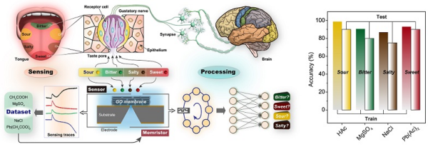 当前,仿生“类脑计算”是人工智能领域的核心研究方向之一,模拟人体感官的感存算一体化系统是该方向的重要研究课题之一。相比于视觉与触觉感知,仿生味觉感存算一体化系统在环境监测、食品安全、健康监测、疾病诊断以及味觉重构等方面将发挥独特功能。与视觉和触觉不同,味觉感知涉及化学(生物)物质交换,器件工作往往要求液相生理环境,具有更复杂的过程。因此,实现仿生味觉感存算一体极具挑战。