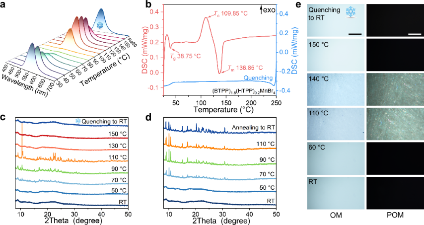 近日,该团队通过一步无溶剂熔融淬火方法,开发出混合金属卤化物高透明玻璃态闪烁屏(BTPP)1.8(HTPP)0.2MnBr4,将快中子成像的空间分辨率由2.56 lp mm-1提高到5 lp mm-1,为目前报道的最高数值。这一闪烁屏的透过率超过70%,光致发光量子产率达85.54%,光输出是同等厚度ZnS(Ag):PP商用闪烁屏的3倍。温度依赖的X射线衍射、光致发光和第一性原理分子动力学计算揭示了不透明多晶态和透明玻璃态之间的可逆转换机制,明晰了玻璃态的形成机制归因于三苯基鏻的高空间位阻以及快速淬灭处理导致的分子随机排列冻结的共同作用。