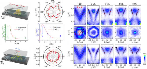 实验上,研究团队利用超高真空分子束外延技术制备了高质量、厚度精确可控的Bi2Te3超薄膜。通过角分辨光电子能谱测量不同厚度Bi2Te3的费米面,拟合出能带弯曲效应随厚度的变化规律。进一步构建Fe/Bi2Te3 异质结后,结合平面波导铁磁共振测试系统和时间分辨磁光克尔效应测试平台,分别在纳秒与飞秒时间尺度探究其自旋动力学。实验结果与理论预测一致:在纳秒尺度观察到各向异性增强的Gilbert阻尼,且其各向异性程度随Bi2Te3层厚度增加呈现先增后减的趋势;而在飞秒尺度下,则检测到近乎各向同性的超快退磁过程。