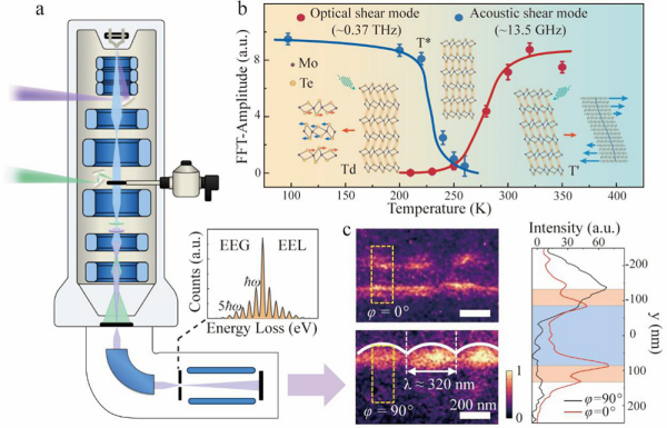 (a)UEM示意图,(b)MoTe2中堆叠序调控的激光诱导剪切声子模式转换,(c)铁填充MWCNTs表面等离激元近场分布