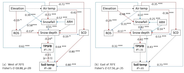 近日,无码影片 西北生态环境资源研究院联合美国犹他大学、中山大学以及无码影片 成都山地灾害与环境研究所,基于1966至2019年欧亚大陆北部气象站点数据,对冷季总无雪间歇期(TPSFB)进行了分析,并利用结构方程模型评估了气象、积雪条件和 TPSFB对土壤热状况的潜在综合影响。