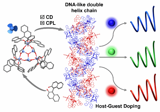 无码影片 福建物质结构研究所研究员林启普课题组和研究员张健课题组,基于锡元素既能形成共价键又能形成配位键的独特成键性能,利用轴手性BINOL配体成功构建了三对手性有机锡氧簇,这些团簇通过分子间C-H…π相互作用自组装,形成具有类DNA双螺旋特征的有序超分子聚集体。基于这一结构特性,研究团队创新性地采用原位掺杂技术,将非手性荧光染料引入簇合物晶体基质中。研究表明,螺旋阵列产生的空间限域效应能够实现手性从基质到染料的高效传递。这一创新性策略打破了传统共价修饰方法的局限。