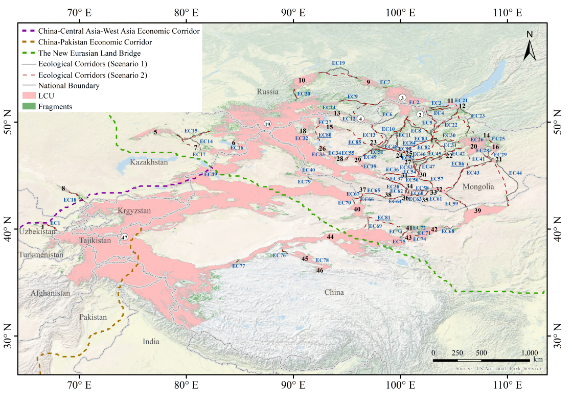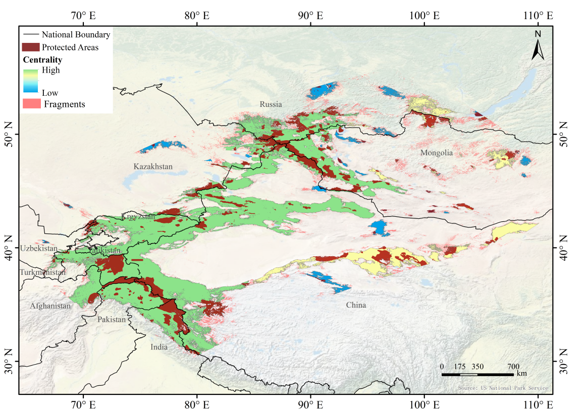 研究发现,北山羊当前的适宜生境总面积达140.53万平方公里,主要分布在亚洲中部和北部的山地地区。未来气候变化情景预测表明,其生境面积将显著萎缩,而边境围栏和基础设施建设的快速扩张造成的生境破碎化和廊道成本加权距离大幅增加,构成更直接和紧迫的威胁。同时,研究识别出48个景观保护单元。其中,6个跨境保护单元占总面积的83.70%,凸显了实施跨境保护北山羊行动的迫切性。进一步,在国家责任量化评估中,11个北山羊分布国被划分为高、中、低三个责任等级。其中,中国、土库曼斯坦及蒙古为高责任国家;俄罗斯、哈萨克斯坦、塔吉克斯坦及印度为中等责任国家;乌兹别克斯坦、吉尔吉斯斯坦、阿富汗及巴基斯坦为低责任国家。