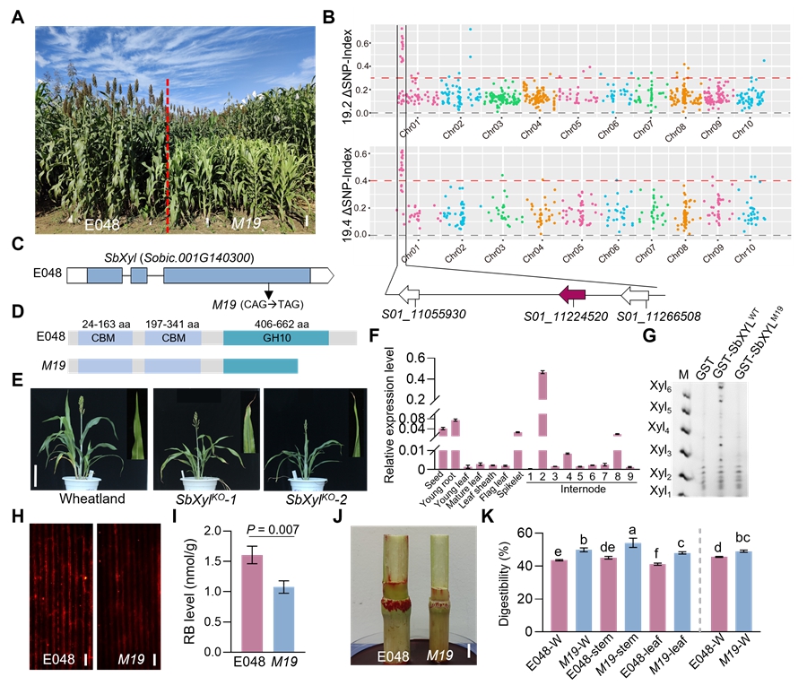 研究团队通过筛选甜高粱E048的EMS突变体库,发现了一株编号为M19的突变体。该突变体叶片表现异常柔软,同时伴随株高降低、叶尖枯死、生物量下降等不利表型。利用MutMap+分析结合基因编辑验证,研究团队将糖基水解酶GH10家族的一个木聚糖水解酶基因SbXyl确定为目的基因。该基因在突变体中发生了一个C到T的点突变导致编码蛋白的提前终止,破坏了GH10结构域,使其不能正常水解底物木聚糖。基因表达模式分析显示,SbXyl在发育中的茎节表现特异的高表达,其功能缺失引发了双重效应:一方面影响维管组织发育,造成维管束面积减小、纤维细胞次生壁变薄,导致水分运输受阻和生长发育缺陷;另一方面影响细胞壁组分和结构,提升了突变体的饲用品质。体外瘤胃消化测定结果显示,未青贮突变体植株较比野生型植株消化率提升了14.7%;青贮后突变体植株消化率仍比野生型植株高7.7%。但突变体生长发育的缺陷限制了其在实际生产中的应用。