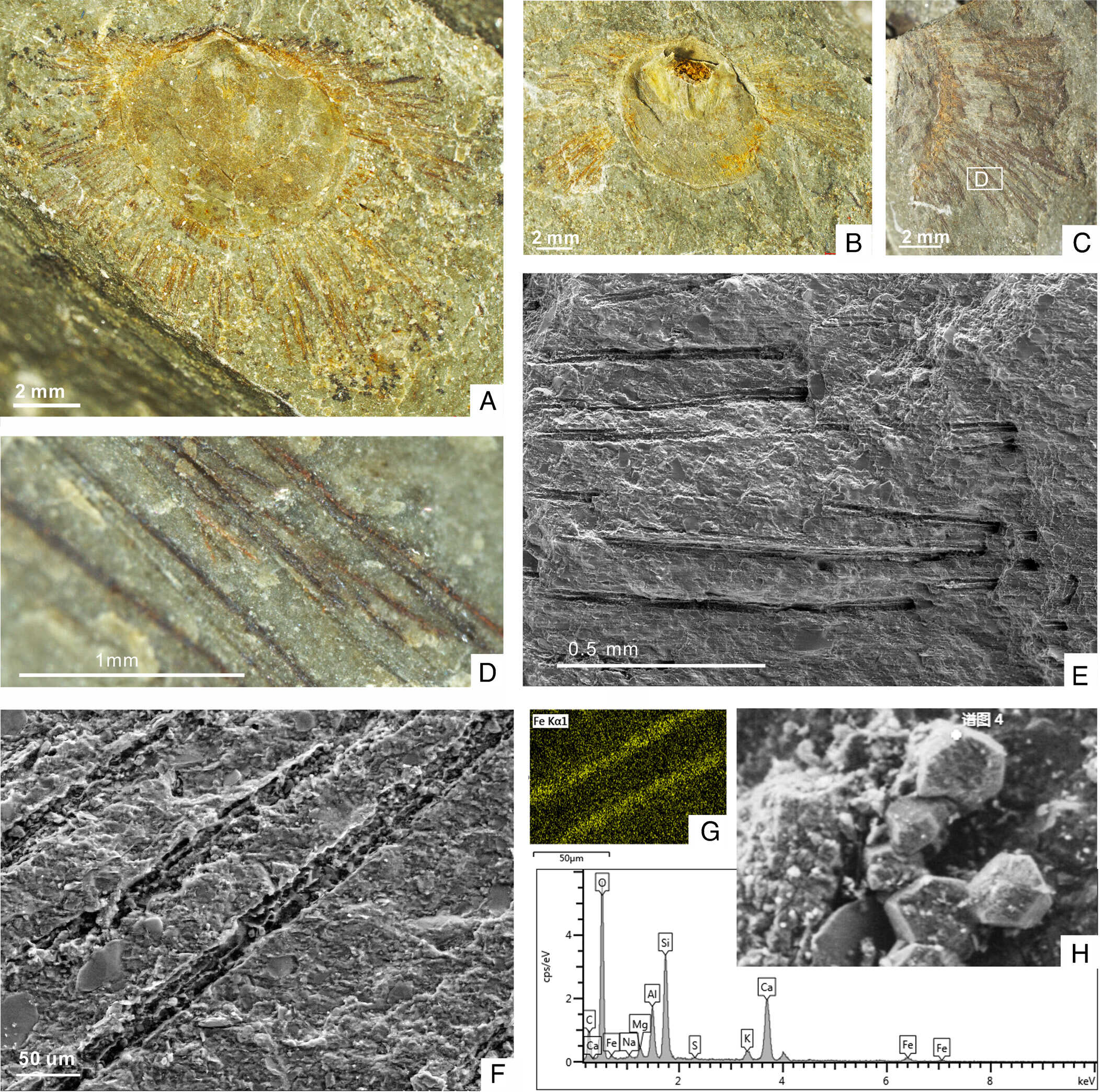 Nucleospira calypta由氧化铁保存的刚毛、腹壳内模、局部放大示刚毛(A-D),及其扫描电镜与能谱分析(E-H)