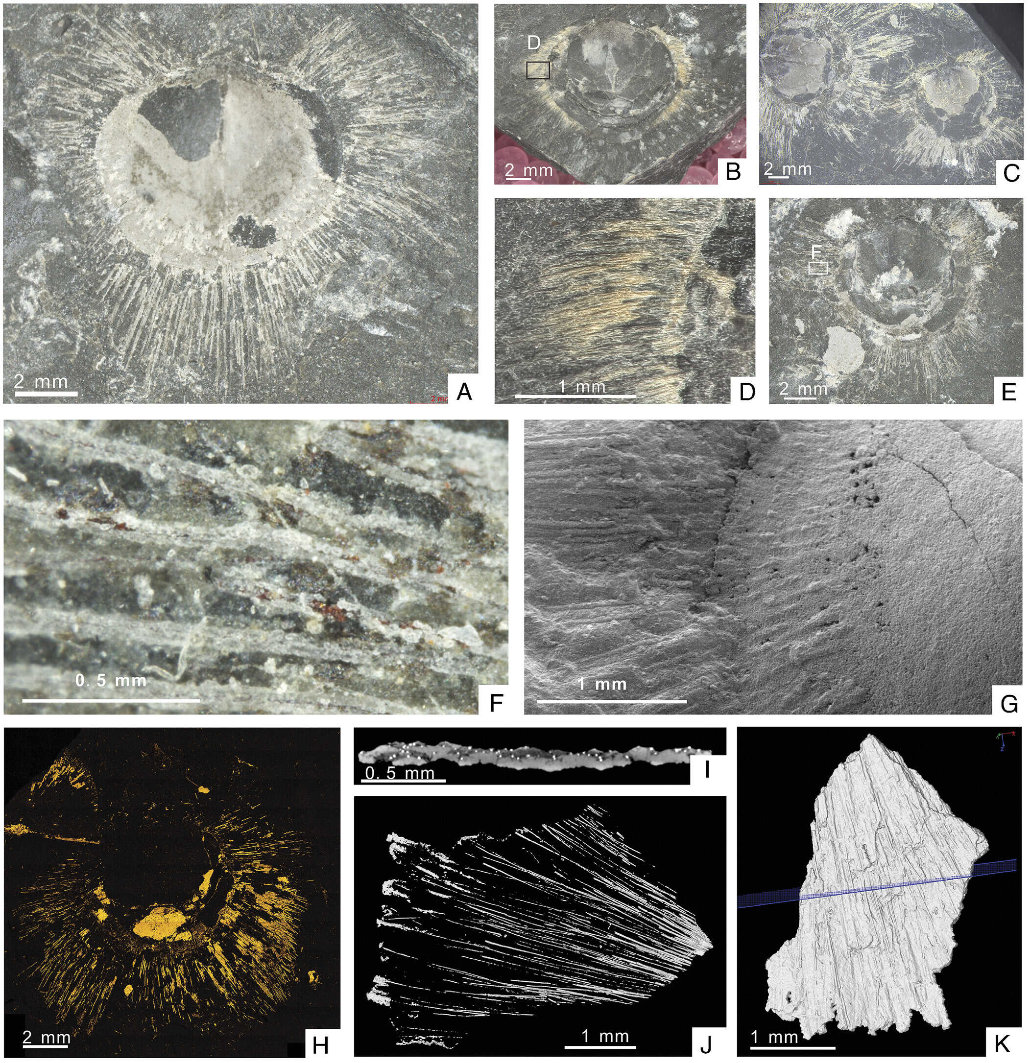 Nucleospira calypta保存于矿化层下的刚毛形态(A-F),及其显微结构(F-H)与显微CT三维重建(I-K)