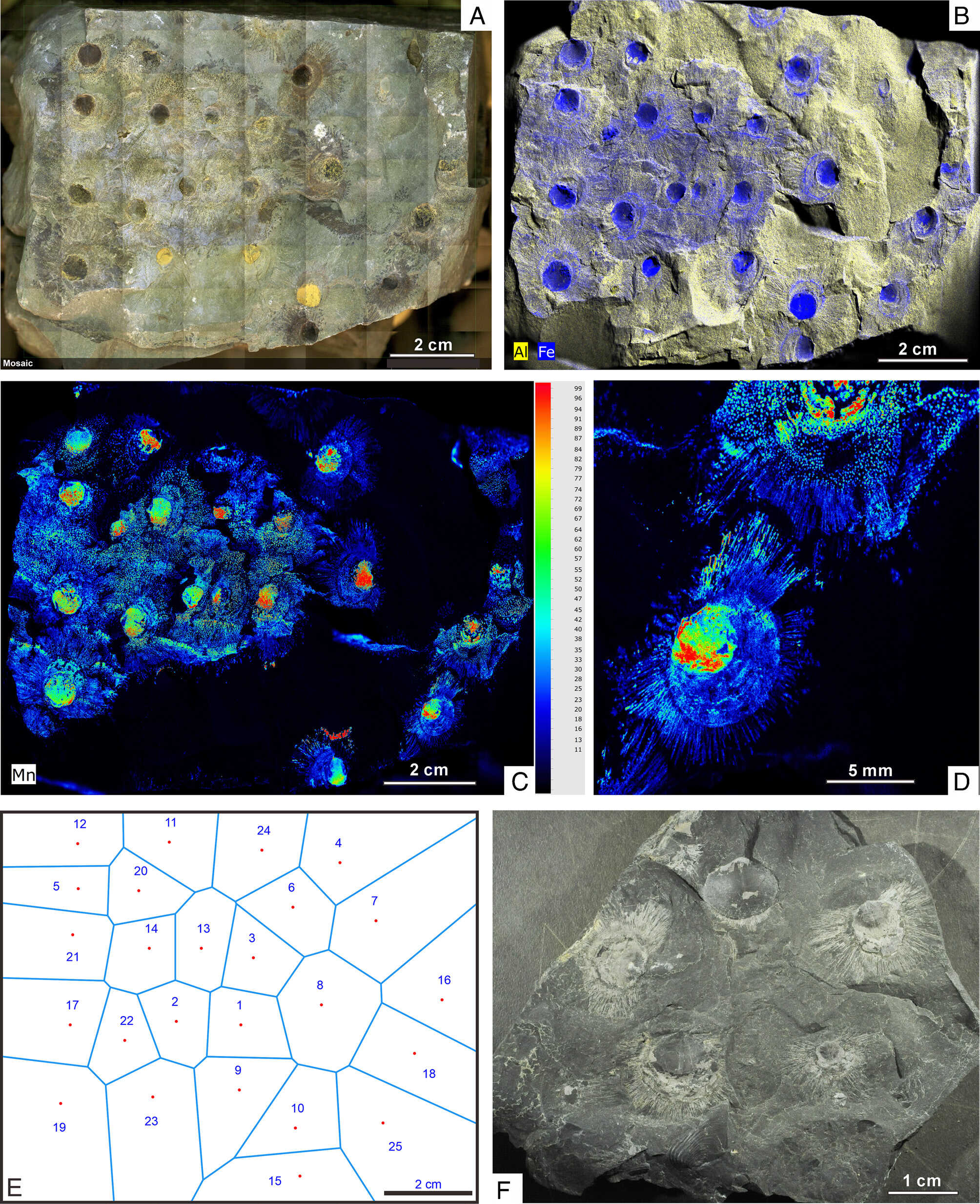 Nucleospira calypta原位埋藏化石居群与其X射线荧光光谱分析元素分布(A-D),其空间分布的泰森多边形分析(E),以及另一小型集群实例(F)