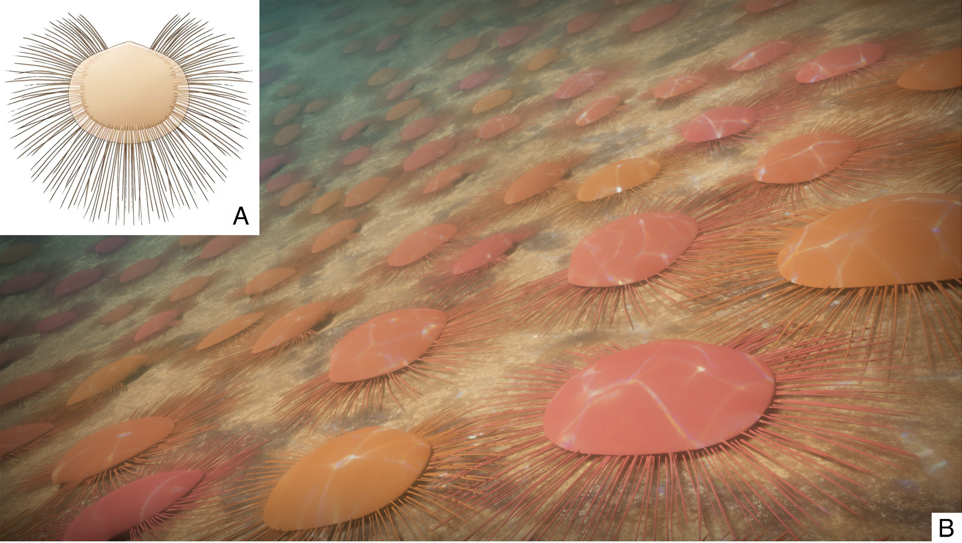 基于化石标本复原的Nucleospira calypta单个个体与其边缘的刚毛(A),以及居群生活状态生态复原图(B)