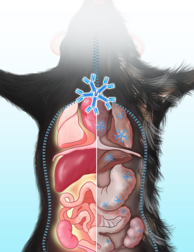 IgM在小鼠多组织中随衰老累积的示意图。图片展示了小鼠从年轻(左)到年老(右)的演变,蓝色的IgM分子在年老小鼠的多个器官中显著富集,寓意其可作为追踪组织/器官衰老和评估抗衰老干预效果的通用生物标志物。