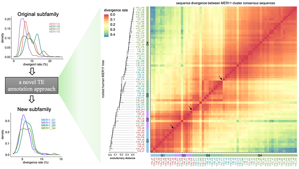 为解决上述问题,研究人员开发了转座子序列注释新方法。该方法利用系统发育分析,将序列相近但被误分至不同亚家族的序列进行整合和重新注释。研究人员针对76个进化上较年轻的内源性逆转录病毒亚家族,成功应用该方法纠正了其中26个亚家族近三分之一的序列注释错误。同时,研究以MER11家族为例,结合系统发育分析与表观基因组学数据,揭示了MER11A/B/C亚家族中大量注释错误,并利用新方法进行了校正。研究人员鉴定出四个新的亚家族:MER11_G1、G2、G3、G4。基于这些更准确的注释信息,研究人员能够对MER11家族表观遗传修饰特征进行更精细的分组研究并追溯其进化历史。