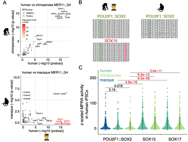 进一步,研究人员利用大规模平行报告系统技术实验验证了来自人、大猩猩及猕猴基因组中共7000多条内源性逆转录病毒MER11序列的转录调控活性,并在单碱基分辨率水平上揭示了与之相关的SOXs等转录因子结合位点序列及其进化规律。研究显示,研究人员在进化上较年轻的MER11序列中鉴定出人类与大猩猩特有的SOXs结合位点序列。该SOXs结合位点序列由灵长类物种进化过程中单碱基缺失事件产生,并显著增强了其调控活性。