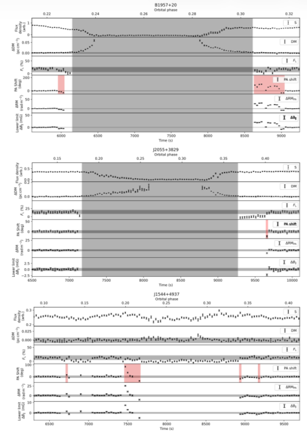 通过对掩食附近色散量变化的分析,研究人员推算出伴星的质量损失率约为10-13_10-12M☉/yr,表明部分蜘蛛脉冲星在哈勃时间尺度内仍可能演化成孤立的毫秒脉冲星。特别地,在对PSR J1544+4937的研究中,研究人员发现该脉冲星在1.25 GHz频率下几乎不存在掩食现象,但出现了线偏振消失的情况。这意味着单纯依赖总强度来判断蜘蛛脉冲星数量的方法可能会低估实际数量,强调了结合偏振信息进行多维度分析的重要性。