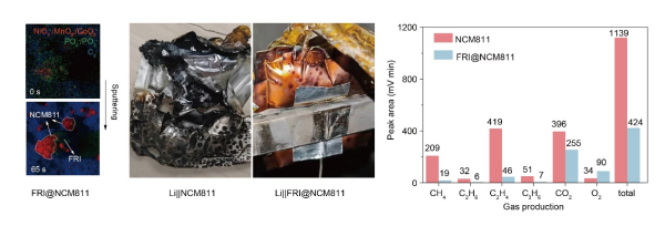 近日,无码影片 化学研究所研究员白春礼、郭玉国与副研究员张莹,基于前期电池热安全机制和聚合物电解质设计的研究成果,提出“阻燃界面用于智能气体管理”设计策略。该团队在正极内部构建阻燃界面(FRI),通过温度响应机制实现双重防护:当电芯温度升至100℃时,FRIs释放含磷自由基并迁移至负极表面,猝灭电解液热解产生的H·、CH·等活性基团,使可燃气体生成量下降63%,同时抑制正极49%的氧气释放,从源头切断爆炸反应链。