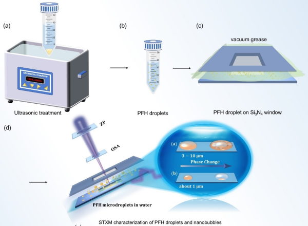 全氟碳化合物因具有优异生物相容性,在生物医学和工业领域应用价值显著。其中,低沸点全氟碳(PFCs)微液滴在生理条件下稳定,可在能量刺激下实现液滴-气泡快速相变,不仅为肿瘤靶向超声成像与药物递送提供新思路,也是研究微尺度相变的理想模型体系。然而,传统技术难以实现多尺度、多相态、纳米级分辨的原位观测,同步辐射软X射线谱学显微技术的发展为此提供了全新解决方案。