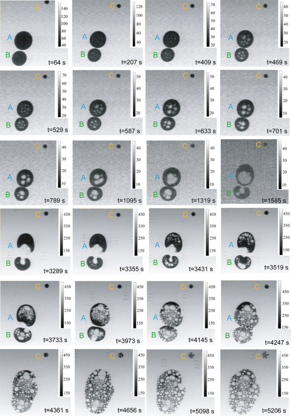 研究团队前期对PFH纳米液滴的可控制备进行了研究,成功制备了高浓度、约100 nm的液滴。同时,进一步系统研究了PFH微液滴在不同盐和pH下的稳定性。科研人员通过超声制备了不同尺寸PFH微液滴,依托上海光源BL08U1A线站的扫描透射软X射线显微镜(STXM),利用X射线原位诱导相变,系统揭示了单个PFH微液滴内纳米气泡的成核生长规律:纳米气泡优先在液滴中心成核,呈现“成核-聚集-稳定-二次成核”的独特动力学过程;10 µm、6 µm、3 µm不同尺寸的液滴分别呈现S形、指数形、线性生长模式;气液界面处的纳米气泡密度较本体区域高数十倍,证实界面在相变中的关键作用;液滴变形存在尺寸效应:>1 µm液滴表现为膨胀/塌陷,<1 µm液滴则发生整体相变。