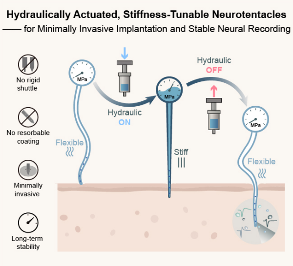 “神经触手”探针技术提出了微创植入解决方案,能够实现柔性神经电极的长期神经记录,为脑区和神经环路功能研究提供了新工具。同时,这一成果为柔性电极的实用化应用迈出了关键一步,也为下一代微创神经接口技术提供了新的解决方案。
