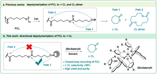 在PCL的溶剂解聚中,由于环链平衡的存在以及环状二聚体的高热力学稳定性,通常会导致环状二聚体大量生成,而二聚体的高稳定性也使其难以重新聚合。因此,如何通过催化体系的设计调控PCL的闭环解聚路径,使其高选择性定向解聚为己内酯单体,具有重要的研究意义。