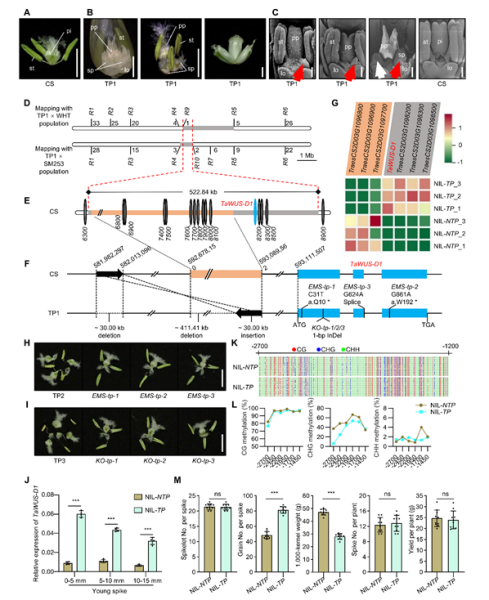 团队利用图位克隆技术,将控制三雌蕊性状的基因(TP)定位在中国春小麦参考基因组(V2.1)2D染色体上约522.84kb的区段内。通过对三雌蕊小麦进行EMS突变,团队从约4万个M2代植株中获得了三个恢复为单雌蕊的突变体。测序分析发现,这三个突变体的突变都发生在同一个基因——TaWUS-D1上。为了进一步验证,团队利用CRISPR-Cas9基因编辑技术在三雌蕊小麦中敲除TaWUS-D1基因,得到的转基因植株也全部恢复为单雌蕊,证明TaWUS-D1是控制三雌蕊性状形成的基因。