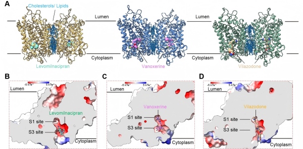 研究团队分别解析了人源NET与抗抑郁药物左米那普仑、维拉佐酮,以及NET与多巴胺转运体双重再摄取抑制剂伐诺司林结合的三个冷冻电镜结构,分辨率达2.44Å至2.52 Å。研究显示,三种复合物中,NET均呈现内向开放构象。其中,左米那普仑结合于NET内向开放构象特异的新型变构位点。该位点被命名为S3,以区别于中央正构位点S1和位于靠近胞外区的外向开放构象变构位点S2。与之不同,维拉佐酮和伐诺司林同时占据S1与S3位点。