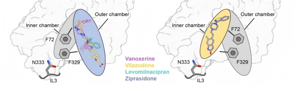团队通过对三个复合物结构精细分析,并与已报道的齐拉西酮–NET复合物进行结构比较,结合分子对接结果,提出了NET抑制剂识别的“瓣膜模型”,即NET内向开放空腔中的两个关键苯丙氨酸残基F72和F329如同“心脏瓣膜”,其侧链相对排列,且侧链构象随不同抑制剂的结合而发生改变。这两个残基将内向开放空腔分隔为内室与外室两个非对称区域。不同化学结构的抑制剂被“瓣膜”引导结合至不同区域,如左米那普仑、维拉佐酮及伐诺司林结合于外室,齐拉西酮结合于内室。该模型揭示了NET如何特异性识别结构多样的抑制剂,为理性药物设计提供了新的理论框架。