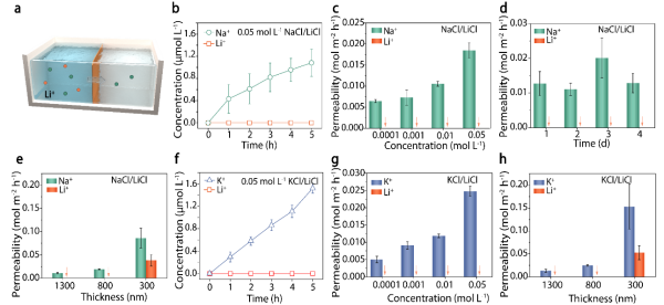 基于上述原理,研究团队构建了一种基于卟吩孔道结构的离子传输通道,实现了对锂离子的近乎完全截留。该膜材料以氯化镍与对位四羧基苯基卟啉(TCPP)为前驱体,通过溶剂热反应结合真空辅助抽滤技术制备而成,形成金属氢氧化物-卟吩框架结构膜(MHOPF)。在该膜中,卟吩孔道高度有序排列,可作为识别并截留锂离子的高效通道。实验结果表明,该膜能有效阻隔锂离子,同时允许钠、钾、钙和镁等离子顺利透过,展现出优异的锂筛选性能。