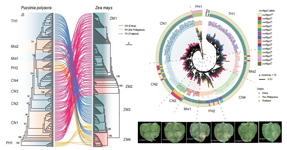 研究团队采用“田间转录组”测序技术,并基于P. polysora高质量参考基因组和玉米B73参考基因组,在田间转录组数据中同时解析了病原菌的遗传变异与寄主的抗性反应,为大规模跨境病害监测提供了新的技术方案。团队通过整合基因流分析与气流轨迹模拟,揭示了寄主选择在本地谱系形成中的关键作用,并指出了中国北方病害流行主要受国内菌源影响,而非持续的境外输入。团队进一步聚焦病原菌关键毒性因子,发现约18%的效应子具有谱系特异性,其中AvrRppC具有最强正选择信号,并演化出17种不同等位基因型。同时,研究显示,菲律宾吕宋岛发现的高分化谱系PH1携带全新AvrRppC等位基因型,可克服抗性品种RppC的抗性,对邻近地区构成潜在的输入威胁。