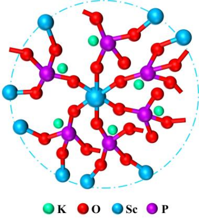 研究选取无顺磁性且具优异固态核磁共振响应特征的Sc3+为模型离子,以模拟小半径重稀土离子在磷酸盐玻璃中的结构行为。研究进一步通过多维固态核磁共振技术,解析Sc2O3-xKPO3玻璃中31P、45Sc与39K的局域结构,揭示了Sc3+的配位特性与聚集规律。结果表明,Sc3+在玻璃网络中完全呈现六配位态,并以共顶形式连接六个磷氧四面体[PO4]。研究确认了