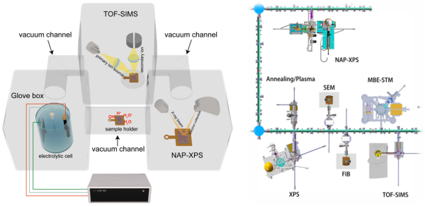 团队利用苏州纳米所纳米真空互联实验站(Nano-X)相关谱学技术,发挥在能源催化方向的表征优势,利用多个互联设备,验证催化剂的解水能力,检测催化剂表层氢元素的浓度和捕捉酸化中间产物,多维度确认类酸催化界面的构建。