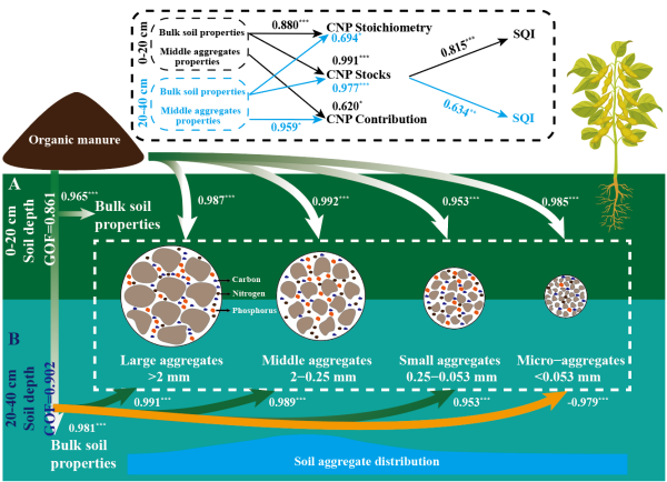 随机森林分析结果表明,原土中氮储量是决定土壤质量的主要因素;表层土壤中大团聚体对原土全磷的贡献率,及深层土壤中微团聚体对原土土壤有机碳的贡献率,是团聚体尺度影响土壤质量指数的重要因素。偏最小二乘路径分析揭示,有机肥施用促进中、大团聚体形成,增强了碳氮磷协同积累,进而提升黑土质量。研究结果为东北黑土区实现黑土可持续利用与粮食安全目标提供科学依据。